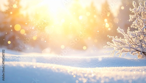 冬の積雪と温かい木漏れ日:黄金の光とボケが降り注ぐ幻想的な雪景色Generated image