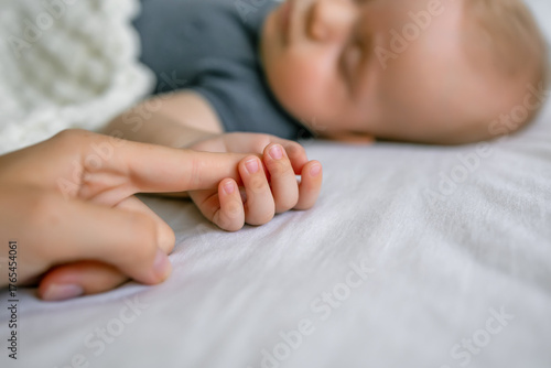 Close up loving mommy holds hand of her newborn while baby sleeping lying on bed during healthy day nap. Cherish, mothers love and care, protection of children, adoption, babyhood concept