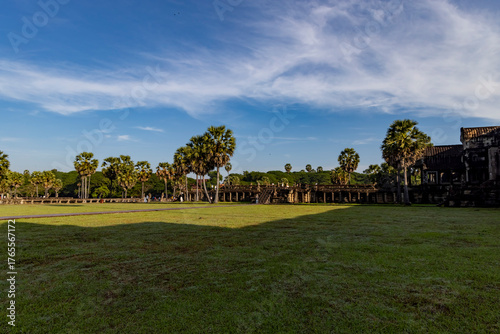 Wide view of angkor wat showing temple lawn, palm trees and the stone causeway with long morning shadows beneath a clear blue sky in siem reap, cambodia