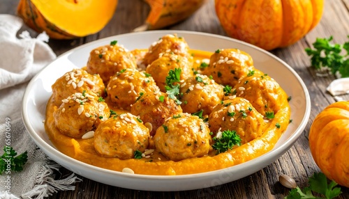 Delicious meatballs sit in a bed of orange puree, garnished with herbs, next to pumpkins on a rustic wooden table