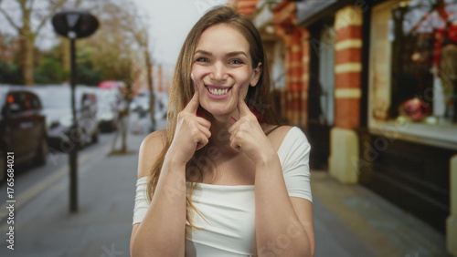 Young caucasian woman in white off shoulder top pinches cheeks and pouts on city street near brick storefront; playfulness.