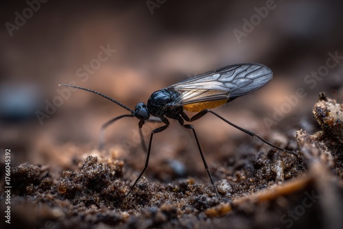 Close-Up View of Adult Dark-Winged Fungus Gnat on Soil, Notorious Pest in Home Agriculture