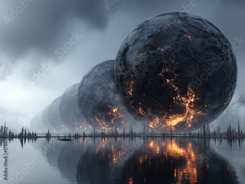 Giant flaming spheres crash toward a city skyline, reflecting destruction and cosmic catastrophe. The image conveys chaos, doom, and dramatic disaster. Parallel universes concept.