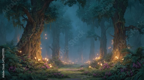 Enchanting Photorealistic Forest Illuminated by Fantasy Light with Ethereal Glow and Natural Elements