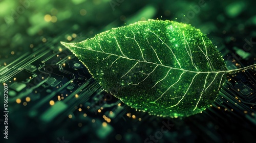 Digital leaf on circuit board, nature technology, future concept, ecological innovation