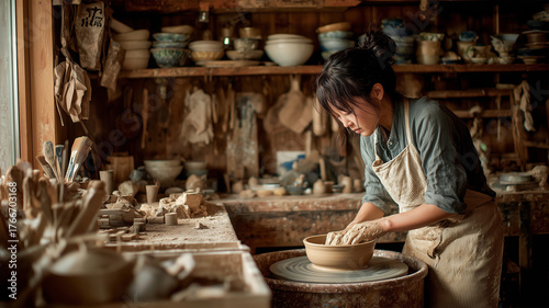手作り陶器を削る日本人女性のクラフト風景の場面