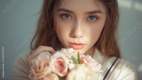 Candid photography of a young woman holding a bouquet of flowers close to her face, gentle sunlight illuminating petals. The soft pastel tones and natural expression create poetic