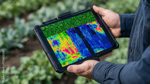 Tablet held by a farmer displaying a vivid thermal image of green fields, glowing heat map tones of red, yellow, and blue showing crop health variations, futuristic precision agric