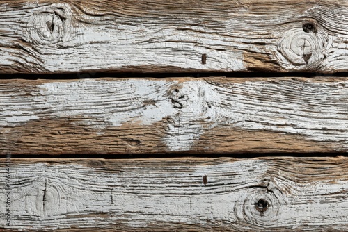 Close-up on weathered white painted wooden planks with visible wood grain and knots creating a textured surface