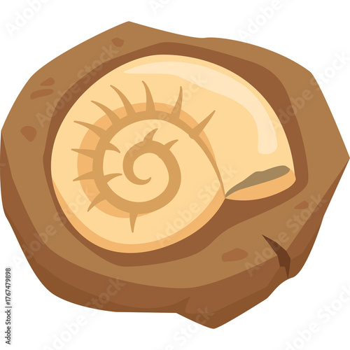 Fossilized spiral seashell embedded in a rough brown stone texture detailed ancient marine life specimen light brown and tan colors natural historical artifact
