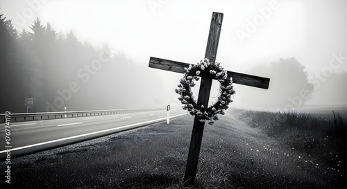Somber roadside memorial cross with a wreath in a foggy landscape, symbolizing the tragic loss of road traffic victims on a desolate highway