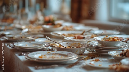 satiety. Banquet table covered with empty plates and leftover food, scattered utensils in muted light. menu design, packaging mockups, designed for food delivery and cloud-kitchen brand materials.