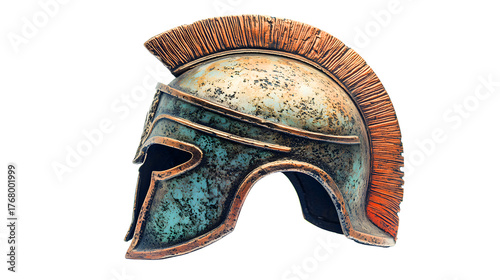 Ancient greek spartan warrior helmet with distinctive crest and weathered metal texture isolated on transparent background