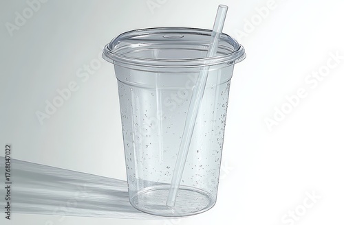 Clear plastic disposable cup with lid and straw on a light surface casting a soft shadow