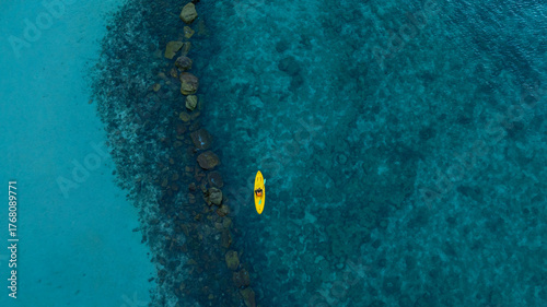 aerial view woman bright yellow kayak with in the vast expanse of crystal clear turquoise water. The seabeds rocky texture is visible beneath the surface, concept marine environment.