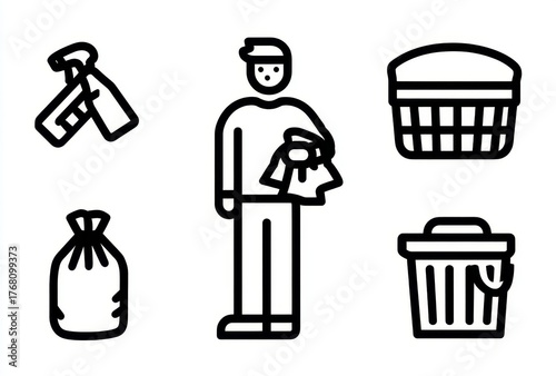 A collection of simple black and white icons depicting cleaning supplies and a person holding a cloth for sanitation.
