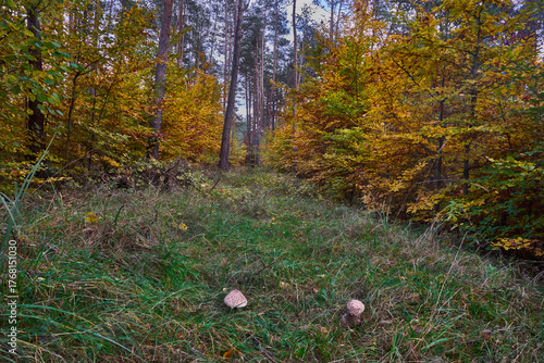 Kolorowe drzewa liściaste i grzyby, jesienne kolory Puszczy Noteckiej, Dolina rzeki Noteć, Polska, Europa