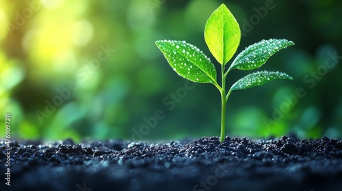 Emergence of Growth: A verdant sprout, symbolizing life's renewal, emerges from the rich, dark earth, bathed in the soft glow of sunlight.