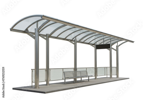 Isolated bus shelter with steel frame and curved transparent roof against no background