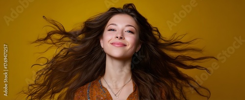 Joyful woman radiates freedom as her long flowing hair dances wildly in the air