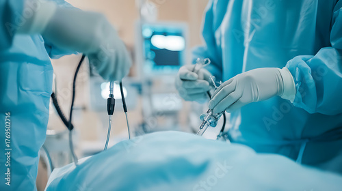 Two medical professionals are shown performing a medical procedure. The surgeons are in blue gowns and are using surgical instruments. The background features medical equipment.