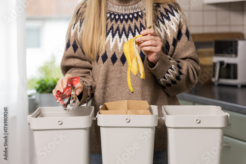 Woman sorting recyclable materials at home, placing banana peels and packaging into separate bins, promoting eco-friendly waste management practices