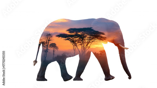 Elephant double exposure with a vibrant african sunset and acacia tree, and conservation nature wildlife symbolizing