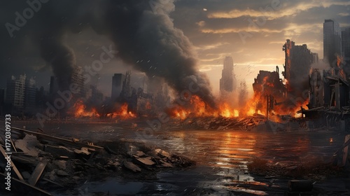 A devastating post-apocalyptic cityscape engulfed in raging infernos with smoke billowing into the twilight sky