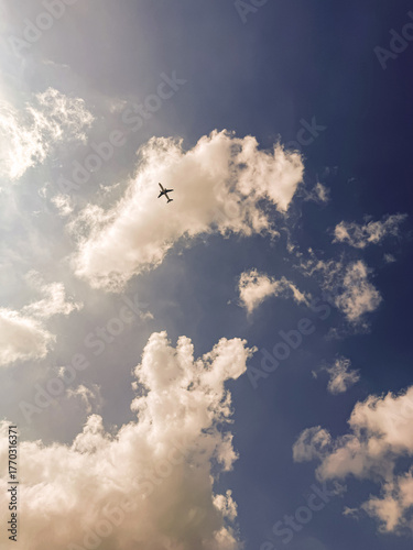 Błękitne niebo, białe chmury kłębiaste, lecący samolot - koncept podróżowania. Wakacje, urlop, podróż służbowa.