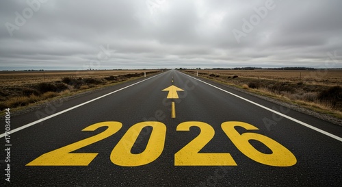 2026 New Year Text Painted on Asphalt Road with Arrow to Future