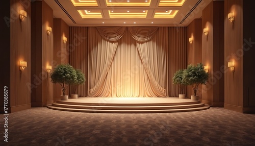 Luxurious event hall interior with stage wooden panels warm lighting and curtains. Empty space for wedding reception ceremony. Elegant interior design party setting fancy hotel room.