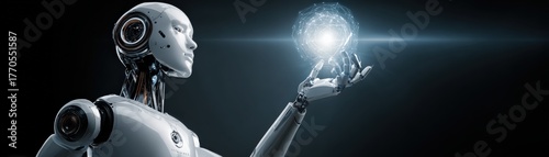 A futuristic robot holds a glowing orb, symbolizing technology and innovation in a sleek, dark environment.