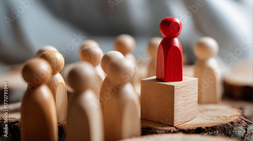 Leadership individuality concept red wooden figure standing elevated on block surrounded by natural wooden figures leader representation uniqueness distinction teamwork