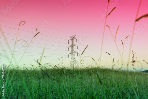 Surreal Landscape with Power Lines – Colorful Gradient Sky and Green Field in Conceptual Environmental Photography, Nature and Technology Contrast for Modern Wall Art and Creative Design