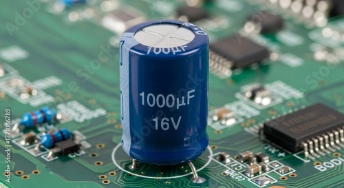 基板に取り付けられた電解コンデンサのクローズアップ写真