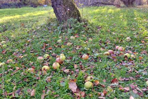 W jesiennym starym sadzie pozostają opadłe jabłka które świadczą o obfitości owoców. Opadłe jabłka w opuszczonym sadzie napawają nostalgią i tęsknotą za latem, są zwiastunem nadchodzących chłodów.