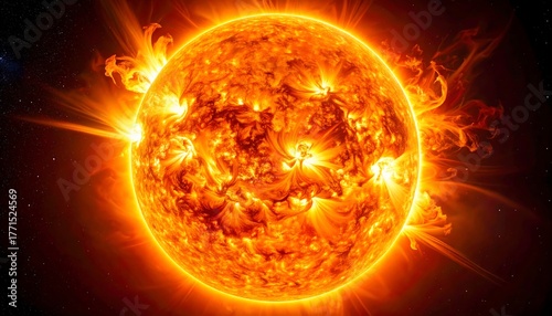 Bright, intense sun with fiery prominences and flares visible against a dark, star-filled background