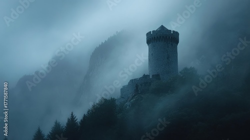 Ancient castle tower mysteriously shrouded in dense, ethereal fog on a mountain.