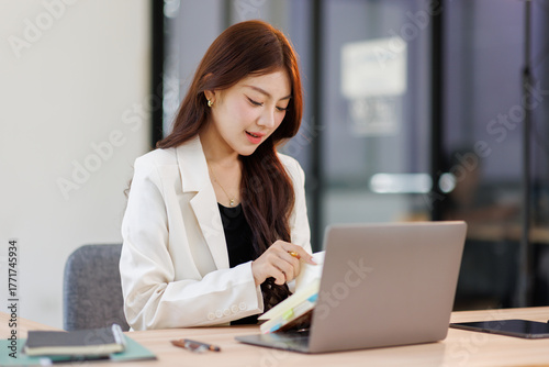 Smiley young business asian woman holding business plan note and sitting at desk in modern coworking office.