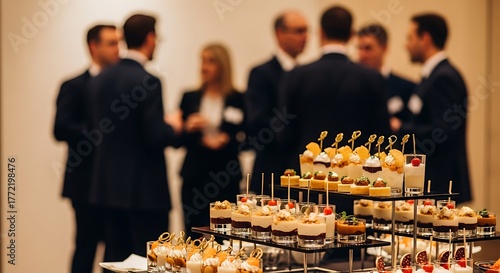 Business people networking at corporate event with delicious dessert bar