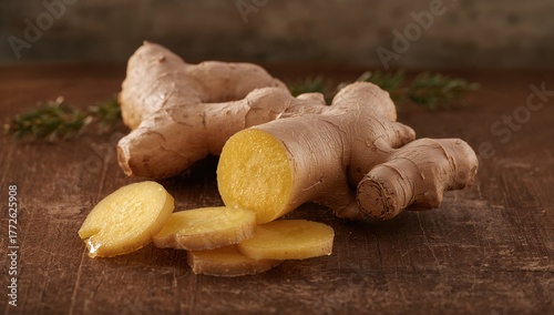 Sliced ginger root displayed on a wooden surface, beneficial for digestion
