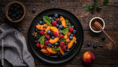 Fruit and berry salad featuring organic gooseberries, raspberries, blueberries, and apricots, beneficial choice for a healthy diet