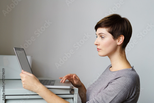 junge geschäftsfrau mit kurzen haaren schaut auf ihr notebook