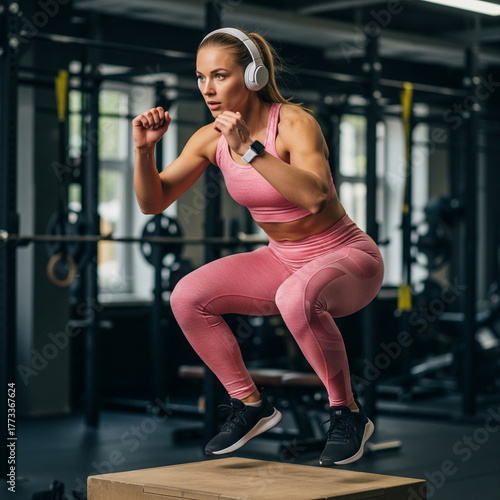 Fit Woman in Pink Workout Gear Jumping on Box in Gym Exercise Routine