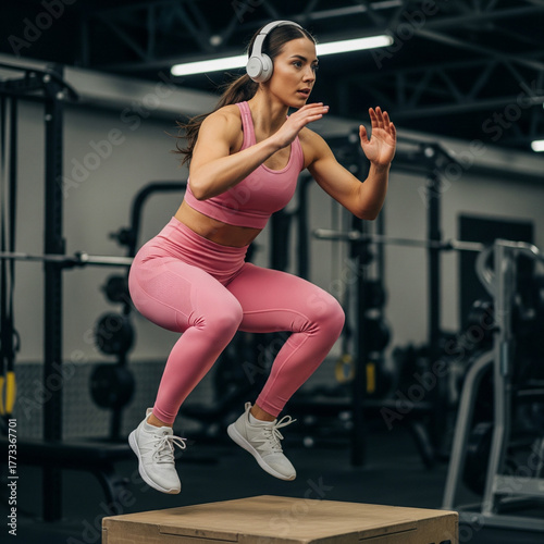 Fit Woman in Pink Workout Gear Jumping on Box in Gym Exercise Routine