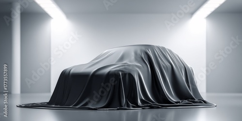 New car covered with black cloth for presentation in bright showroom