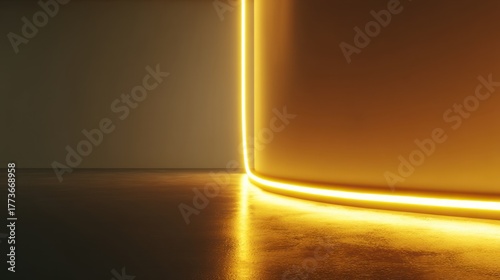 Empty futuristic room with yellow neon light glowing along curved wall and floor. Abstract modern interior for product display.