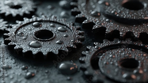 Close up of wet cogwheel gears covered with water drops on a black background. Mechanical texture concept for precision engineering.