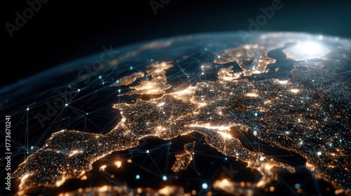 Earth with illuminated city light showing European continent and global network connection. Information exchange and business concept.