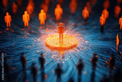 Illumination of a Leader: A lone figure stands elevated at the center of a mesmerizing technological network, bathed in radiant light.